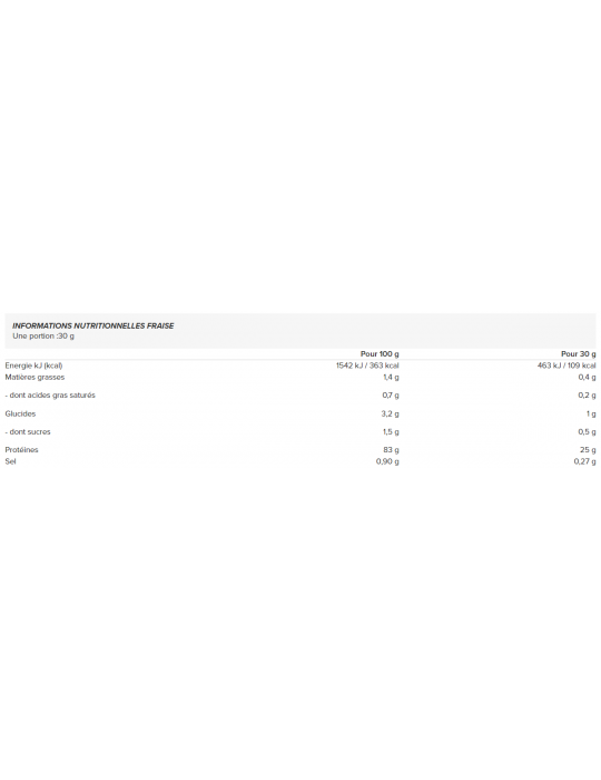 Ingrediente do morango: Isolado de proteína de soro de leite hidrolisado(leite) (49%), isolado de proteína de soro de leite (leite) (47%), aromas, emulsionante (lecitinas), sal, corante (maltodextrina, sumo de beterraba vermelha em pó), acidificantes (ácido málico, ácido cítrico), edulcorantes (sucralose, glicosídeos de esteviol de estévia), antiaglomerante (dióxido de silício).