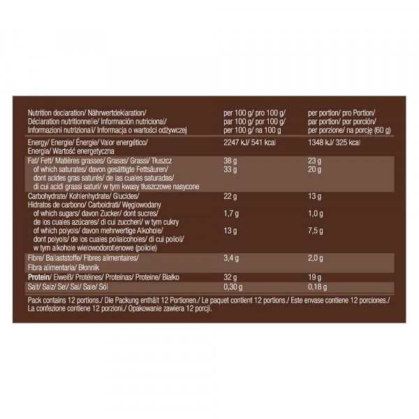 [édulcorant: maltitols; graisses végétales (palme, palmiste, karité), 13% cacao maigre (beurre de cacao 10-15%), émulsifiant: lécithines (de tournesol)]Ingredientes Chocolate duplo: mistura de proteínas (hidrolisado de colagénio, concentrado de proteínas de soro de leite(leite)), gordura de palmiste, 10% de cobertura com sabor a chocolate, 10% de cacau, 9% de bolacha [farinha de trigo, amido de trigo, açúcar, estabilizador: maltitóis; emulsionante: lecitinas (soja); óleos vegetais (coco, soja), sal, corante: E 150d; edulcorante: acessulfame-K; aromatizante, xarope de glucose, reguladores de acidez: carbonatos de sódio, carbonatos de amónio], estabilizador: maltitóis; edulcorante: sucralose.