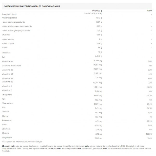Chocolate preto: massa de cacau, edulcorante: maltitol, manteiga de cacau, emulsionante: lecitina de cacau soja,Aroma natural de baunilha, caseína Glanbia® MPI90 e cereais crocantes extrudidos: feitos a partir de farinha de trigo Glanbia® trigo, de malte extrudido (farinha de trigo, farinha de arroz malte, bicarbonato de sódio, sal, açúcar, aroma natural (baunilha)).