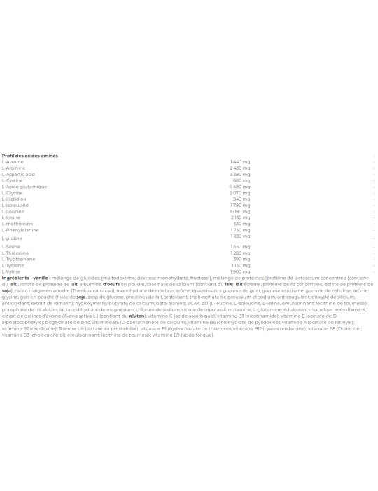 Ingredientes - baunilha :Mistura de hidratos de carbono: [maltodextrine, dextrose monohydraté, fructose ], mistura de proteínas: [proteína concentrada de soro de leite (contém leite), isolado proteico de leite, albumina de ovos pó, caseinato de cálcio (contém leite), leite leite desnatado, proteína de arroz concentrada, isolado de proteína de arroz sojaCacau em pó (Theobroma cocoa); creatina mono-hidratada; aromatizante; espessantes: goma de guar, goma xantana, goma de celulose; aromatizante; glicina; gordura em pó (óleo de coco) soja, xarope de glucose, proteínas do leite, estabilizador: trifosfato de sódio e potássio, anticoagulante: dióxido de silício, antioxidante: extrato de alecrim); hidroximetilbutirato de cálcio; beta-alanina; BCAA 2:1:1 (L-leucina, L-isoleucina, L-valina, emulsionante: lecitina de girassol); fosfato tricálcico; lactato de magnésio di-hidratado; cloreto de sódio; citrato tripotássico; taurina; L-glutamina; edulcorantes: sucralose, acessulfame-K; extrato de sementes de aveia (Avena sativa L.) (contém glúten); vitamina C (ácido ascórbico); vitamina B3 (nicotinamida); vitamina E (acetato de D-alfa-tocoferilo); bisglicinato de zinco; vitamina B5 (D-pantotenato de cálcio); vitamina B6 (cloridrato de piridoxina); vitamina A (acetato de retinilo); vitamina B2 (riboflavina); Tolerase L® (lactase com pH estabilizado); vitamina B1 (cloridrato de tiamina); vitamina B12 (cianocobalamina); vitamina B8 (D-biotina); vitamina D3 (colecalciferol); emulsionante: lecitina de girassol; vitamina B9 (ácido fólico).