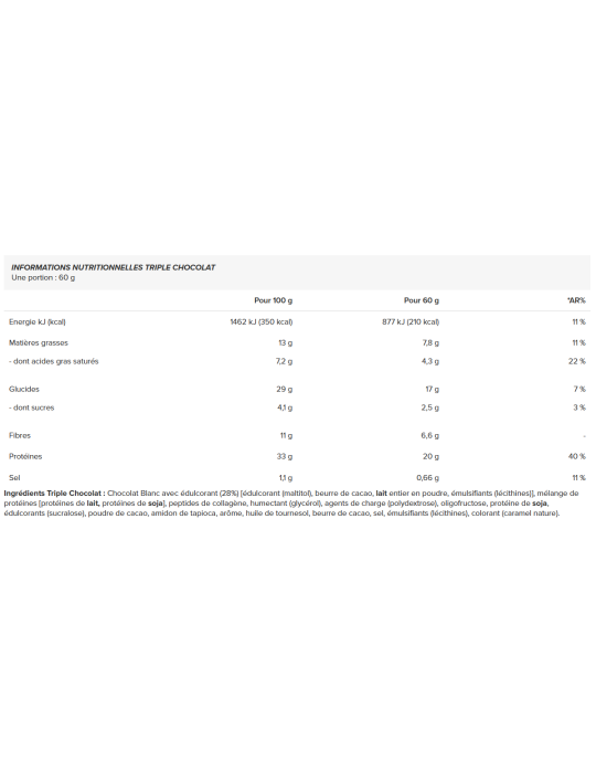 Ingredientes Chocolate triplo :Chocolate branco com edulcorante (28%) [edulcorante (maltitol), manteiga de cacau,leitePó, emulsionantes (lecitinas)], mistura de proteínas [proteínas do leite, proteínas do leite leite,proteínassojaPéptidos de colagénio, humectante (glicerol), agentes de volume (polidextrose), oligofrutose, proteína desoja, edulcorantes (sucralose), cacau em pó, amido de tapioca, aroma, óleo de girassol, manteiga de cacau, sal, emulsionantes (lecitinas), corante (caramelo simples).