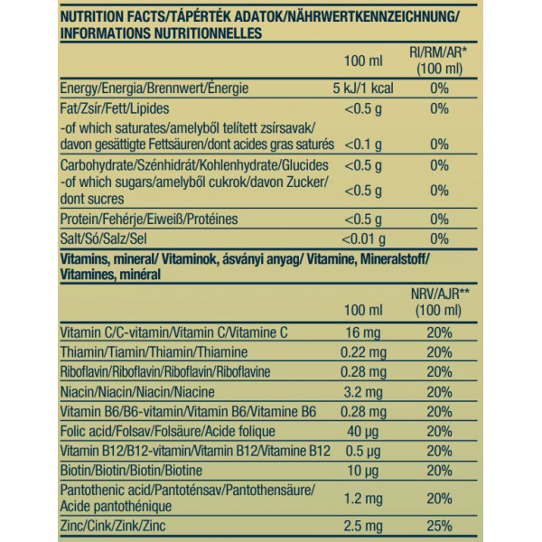 Este produtosem energia complementa o seu aporte vitamínico diário com 9 vitaminas e zinco. A água vitaminada zero (500 ml ) contém vitaminas hidrossolúveis fisiologicamente importantes, como a vitamina C e todas as vitaminas do grupo B, que estão envolvidas no metabolismo energético, mas também contribuem para o bom funcionamento do sistema imunitário, do sistema nervoso e reduzem a fadiga .