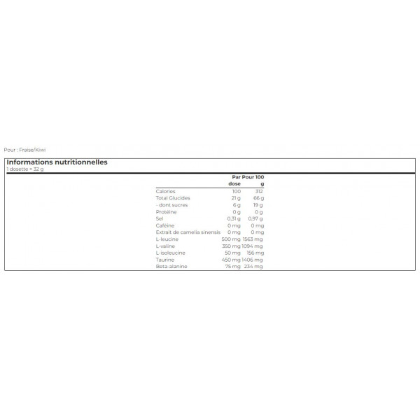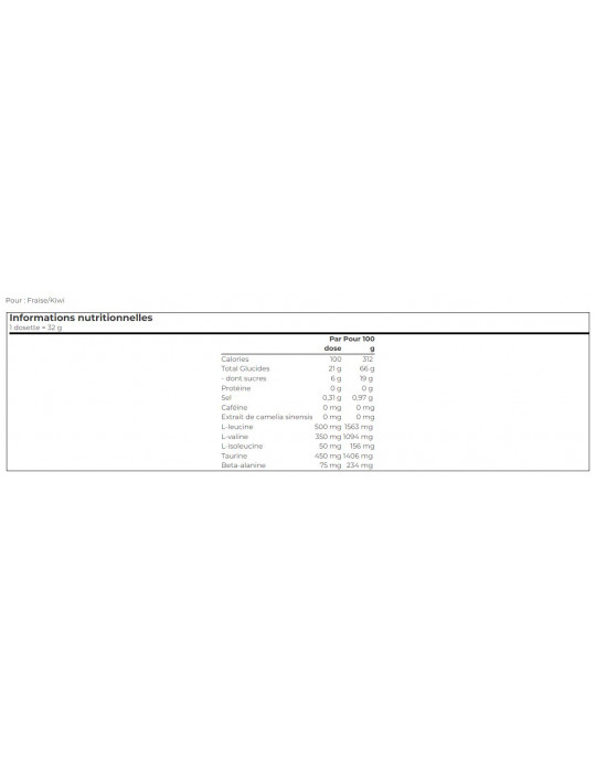 Ingredientes Morango Kiwi :Maltodextrina, água, frutose, l-leucina, taurina, citrato de potássio, citrato de sódio, ácido cítrico, ácido málico, carbonato de cálcio, sal marinho, l-valina, aroma natural, beta-alanina, l-isoleucina, goma gelana, conservantes (benzoato de sódio, sorbato de potássio), triglicéridos de cadeia média.