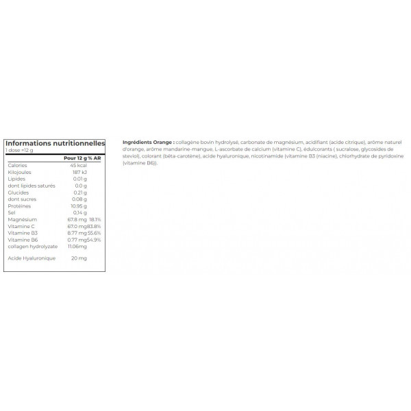 Ingredientes laranja: colagénio bovino hidrolisado, carbonato de magnésio, acidificante (ácido cítrico), aroma natural de laranja, aroma de tangerina e manga, L-ascorbato de cálcio (vitamina C), edulcorantes (sucralose, glicosídeos de esteviol), corante (beta-caroteno), ácido hialurónico, nicotinamida (vitamina B3 (niacina), cloridrato de piridoxina (vitamina B6)).