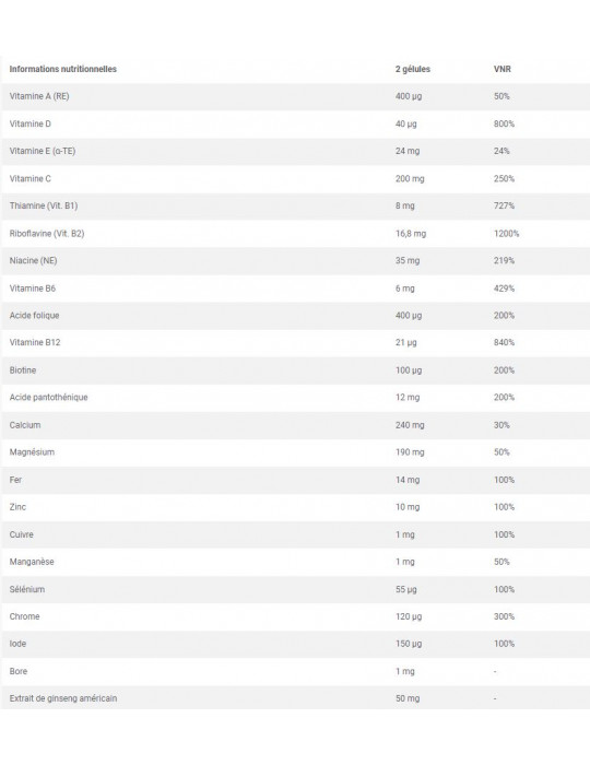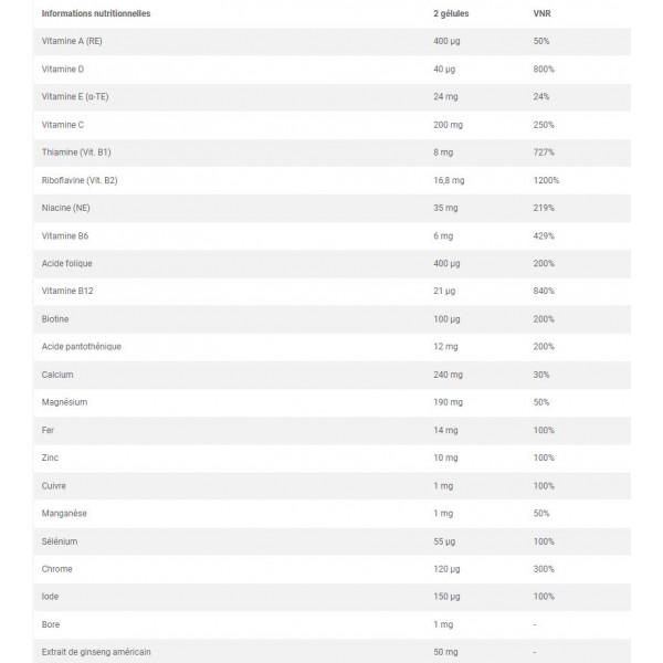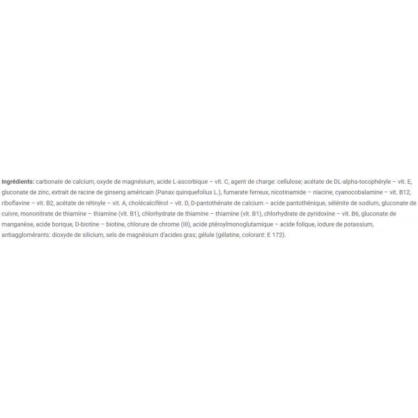 Ingredientes: carbonato de cálcio, óxido de magnésio, ácido L-ascórbico - vit. C, agente de volume: celulose; acetato de DL-alfa-tocoferilo - vit. E, gluconato de zinco, extrato de raiz de ginseng americano (Panax quinquefolius L.), fumarato ferroso, nicotinamida - niacina, cianocobalamina - vit. B12, riboflavina - vit. B2, acetato de retinilo - vit. A, colecalciferol - vit. D, D-pantotenato de cálcio - ácido pantoténico, selenito de sódio, gluconato de cobre, mononitrato de tiamina - tiamina (vit. B1), cloridrato de tiamina - tiamina (vit. B1), cloridrato de piridoxina - vit. B6, gluconato de manganês, ácido bórico, D-biotina - biotina, cloreto de crómio (III), ácido pteroilmonoglutâmico - ácido fólico, iodeto de potássio, antiaglomerantes: dióxido de silício, sais de magnésio de ácidos gordos; cápsula (gelatina, corante: E 172).