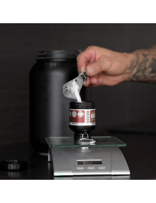 Adicione a sua dose de suplemento ao funil, desenroscando o fundo e fechando-o bem. Vire-o ao contrário e utilize a parte superior como funil para o seu batido. Desfruta do teu batido!