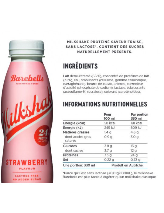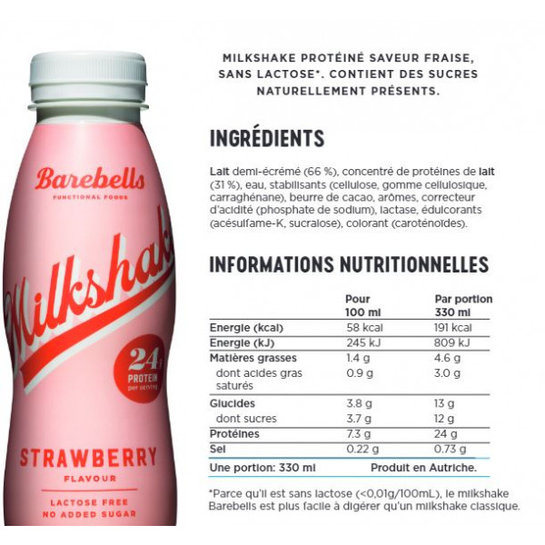 Este batido cremoso e suave, sem adição de açúcar ou lactose, é um verdadeiro prazer de beber! Com 24 g de proteínas por garrafa, é um snack delicioso e saciante. É a bebida proteica perfeita para os consumidores que praticam desporto várias vezes por semana ou simplesmente para um lanche saudável, saboroso e acima de tudo prático a qualquer hora do dia.