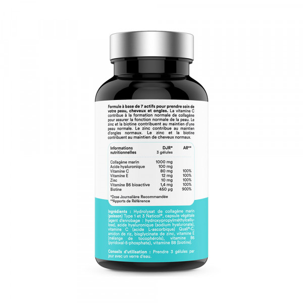 Este complexo contém uma dose elevada de colagénio marinho hidrolisado patenteado Naticol®. O colagénio é uma proteína estrutural naturalmente presente no organismo e a mais abundante no corpo (constitui 75% da estrutura da pele). Mas com a idade, a capacidade do organismo para o sintetizar diminui, o que pode provocar o aparecimento de rugas e rídulas e uma pele mais baça. Com 1000 mg de colagénio marinho hidrolisado por dose, este suplemento favorece a elasticidade e a hidratação da pele.