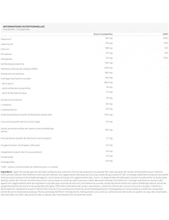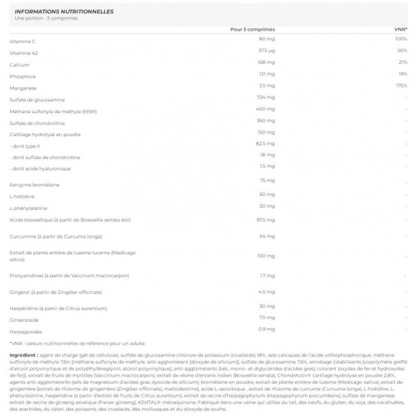 Ingredientes : agente de volume (gel de celulose), cloreto de potássio de sulfato de glucosamina (crustáceos) 18%, sais de cálcio do ácido ortofosfórico, metilmetanossulfonilo 7,6% [méthane sulfonyle de méthyle, anti-agglomérant (dioxyde de silicium)], sulfato de glucosamina 7,6%, revestimento {stabilisants [copolymère greffé d'alcool polyvinylique et de polyéthylèneglycol, alcool polyvinylique], anti-agglomérants (talc, mono- et diglycérides d'acides gras), colorant (oxydes de fer et hydroxydes de fer)}, extrato de frutos de mirtilo (Vaccinium macrocarpon), extrato de resina de incenso indiano (Boswellia serrata), pó de cartilagem hidrolisada ChondrActiv® 2,8%, antiaglomerantes (sais de magnésio de ácidos gordos, dióxido de silício), bromelaína em pó, extrato integral de plantas de luzerna (Medicago sativa), extrato de gengibre [extrait de rhizome de gingembre (Zingiber officinale), maltodextrine], ácido L-ascórbico, extrato de rizoma de curcuma (Curcuma longa), L-histidina, L-fenilalanina, hesperidina (do extrato do fruto de Citrus aurantium), extrato de raiz de harpagophytum (Harpagophytum procumbens), sulfato de manganês, extrato de raiz de ginseng asiático (Panax ginseng), menaquinona K2VITAL®. Fabricado numa fábrica que utiliza leite, ovos, glúten, soja, amendoins, amendoins, aipo, peixe, marisco e dióxido de enxofre.