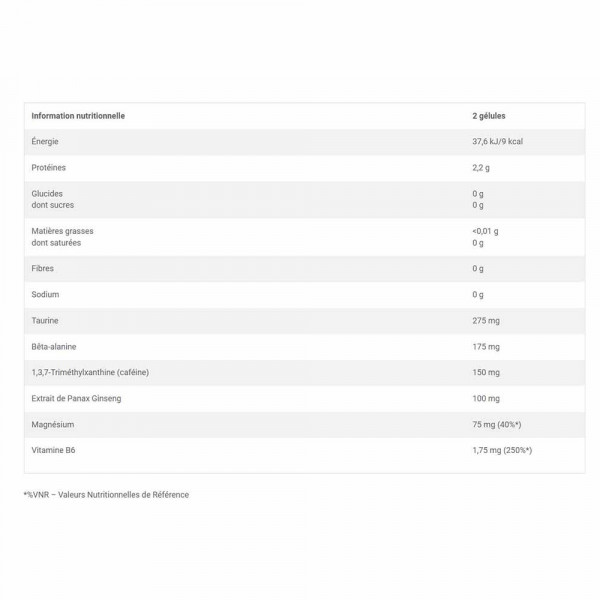- Valores de Referência NutricionalIngredientes: 21,1% taurina, 19,2% L-tirosina, 13,4% beta-alanina, óxido de magnésio, cafeína anidra, extrato de guaraná (Paullinia cupana Kunth., 22% cafeína), extrato de Panax ginseng coreano, cloridrato de piridoxina - vit. B6, agente de volume - celulose microcristalina, agente antiaglomerante - estearato de magnésio, cápsula (gelatina bovina, corante: E 171).