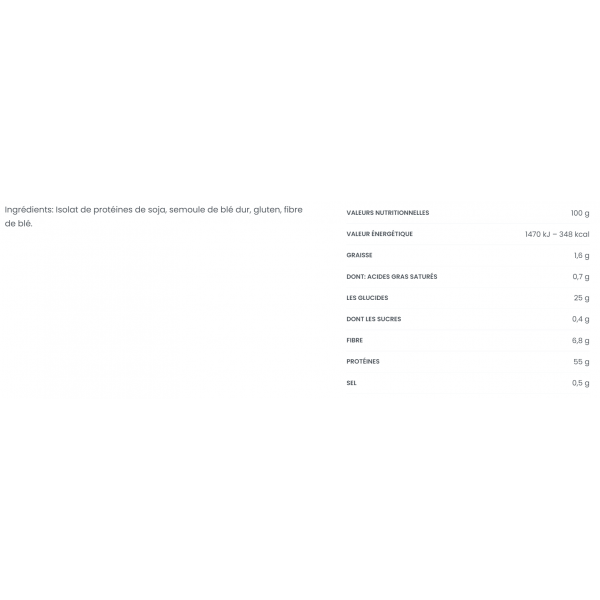 Ingredientes: Proteína de soja isolada, sêmola de trigo duro, glúten, fibra de trigo.
