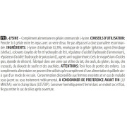 A L-lisina permite ao organismo formar proteínas e está presente em grandes quantidades no tecido muscular. É igualmente utilizada para a saúde e a integridade da pele e dos lábios, pois intervém na produção de colagénio e na manutenção dos tecidos.