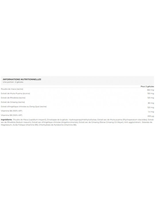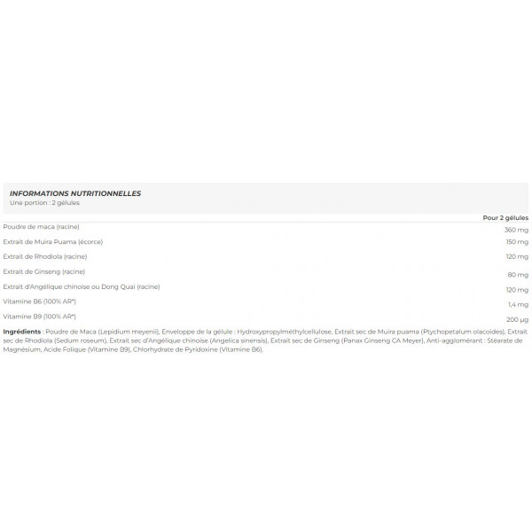 Ingredientes: Maca em pó (Lepidium meyenii), Invólucro da cápsula: Hidroxipropilmetilcelulose, Extrato seco de Muira puama (Ptychopetalum olacoides), Extrato seco de Rhodiola (Sedum roseum), Extrato seco de Angelica chinesa (Angelica sinensis), Extrato seco de Ginseng (Panax Ginseng CA Meyer), Antiaglomerante: Estearato de magnésio, Ácido fólico (Vitamina B9), Cloridrato de piridoxina (Vitamina B6).