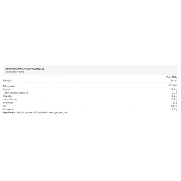 Ingredientes: 81% de salmão do Atlântico (salmo salar) sem pele, cultivado na Noruega ou na Escócia, água, sal.