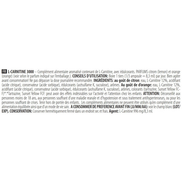 Ingredientes Sabor a laranja: água, L-Carnitina 12%, acidificante (ácido cítrico), conservante (ácido sórbico), edulcorantes (acessulfame K, sucralose), aromatizantes, corantes (tartrazina, amarelo-sol FC-F)*.