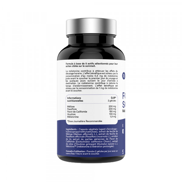 Composto por uma sinergia de 6 plantas ricas em princípios activos: melatonina vegetal, erva-cidreira, passiflora, papoila da Califórnia, valeriana e lúpulo. Esta fórmula contribui naturalmente, sem risco de dependência, para reduzir o tempo de adormecimento e favorece um sono profundo e reparador.