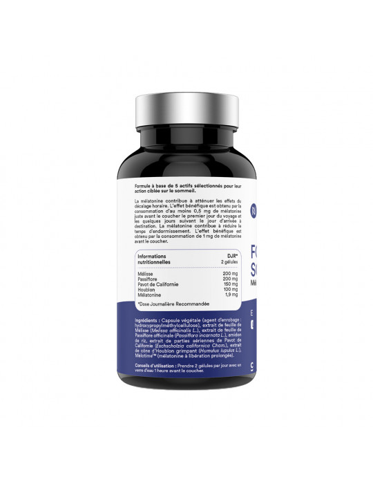 Ingredientes : Cápsula vegetal (agente de revestimento: hidroxipropilmetilcelulose), extrato de folha de erva-cidreira (Melissa officinalis L.), extrato de folha de passiflora (Passiflora incarnata L.), amido de arroz, extrato de partes aéreas de papoila da Califórnia (Eschscholzia californica Cham.), extrato de cone de lúpulo trepador (Humulus lupulus L.), extrato de partes aéreas de hipericão (Hypericum perforatum L.) titulado a 10% de melatonina e 0,0001% de hipericina (
