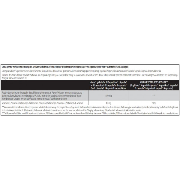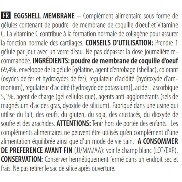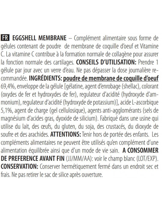 [gélatine, agent d’enrobage (shellac), colorant (oxydes de fer et hydroxydes de fer), régulateur d’acidité (hydroxyde d’ammonium), régulateur d’acidité (hydroxyde de potassium)]INGREDIENTES: pó de membrana de cascade ovo 69,4%, invólucro da cápsula, ácido L-ascórbico 5,1%, agente de volume (gel de celulose), antiaglomerantes (sais de magnésio de ácidos gordos, dióxido de silício).