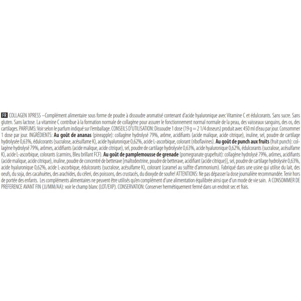 Ingredientes Ananás: colagénio hidrolisado 79%, aromatizantes, acidificantes (ácido málico, ácido cítrico), inulina, sal, cartilagem hidrolisada em pó 0,63%, ácido hialurónico 0,62%, ácido L-ascórbico, edulcorantes (sucralose, acessulfame k), corante (riboflavinas).