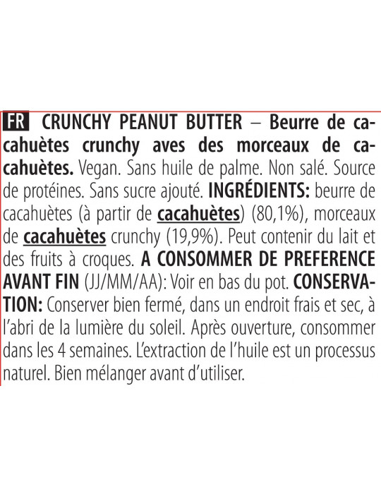 Crocante : Manteiga de amendoim (80,1%), pedaços de amendoim crocantes (19,9%).
