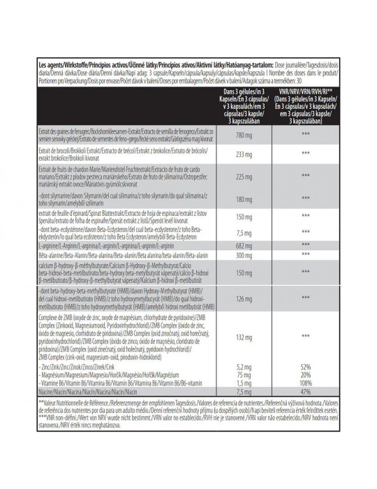 A niacina (7,5 mg) contribui para o normal metabolismo energético. A arginina (682 mg) está envolvida no processo de recuperação muscular. A beta-alanina (900 mg) é um aminoácido que melhora a sua capacidade física e o seu desempenho em termos de resistência. Por fim, considera-se que o cardo mariano protege o fígado das toxinas e regenera-o.