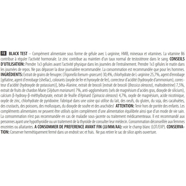 Black Test (90 cápsulas) contém apenas ingredientes naturais, sem esteróides, hormonas, pró-hormonas, aspartame ou OGM.
