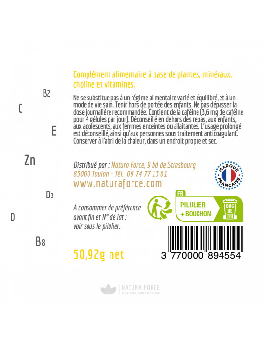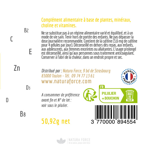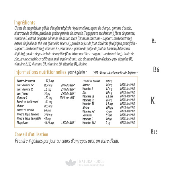 Ingredientes: citrato de magnésio; cápsula de origem vegetal: hidroxipropilmetilcelulose; agente de volume: goma acácia; amargo de colina; pó de sementes de trigo sarraceno germinadas (Fagopyrum esculentum); fibra de maçã; vitamina C; extrato da parte aérea de manjericão sagrado (Ocimum sanctum - transportador : maltodextrina); extrato de folhas de chá verde (Camelia sinensis); extrato de frutos de acerola (Malpighia punicifolia - veículo maltodextrina); polpa de baobá em pó (Adansonia digitata); extrato de bagas de mirtilo (Vaccinium myrtillus - veículo : maltodextrina); vitamina E; cirato de zinco; vitamina K2; levedura enriquecida com selénio; agente antiaglomerante: sal de ácido gordo de magnésio; niacina; vitamina B12; vitamina D; vitamina B6; vitamina B1; biotina.