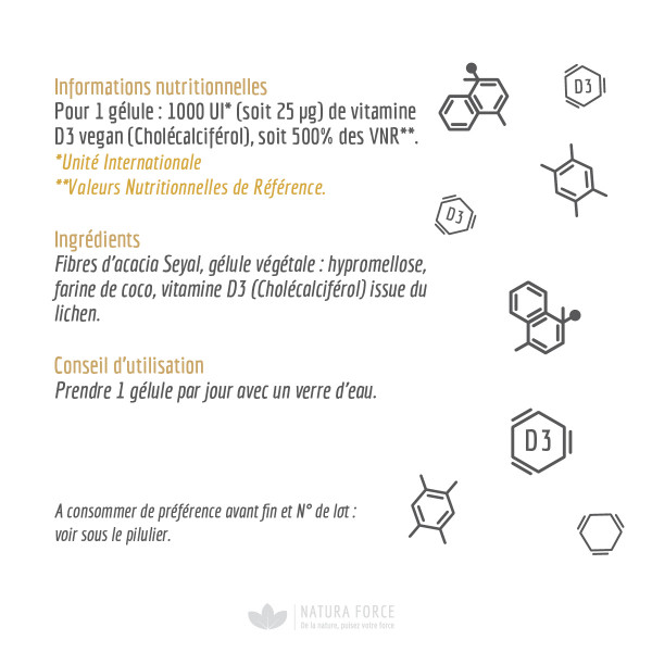 A vitamina D3 é o segundo componente da vitamina D e é um dos mais benéficos para o ser humano, pois é duas vezes mais eficaz para aumentar os níveis sanguíneos de vitamina D. De facto, fornece-lhe 1000 UI de colecalciferol (D3) de que necessita numa só cápsula.