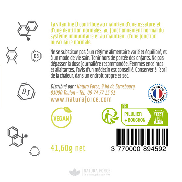 Este produto à base de cápsulas vegetais é também100% vegan. A vitamina D3 é adequada para todos os regimes alimentares.
