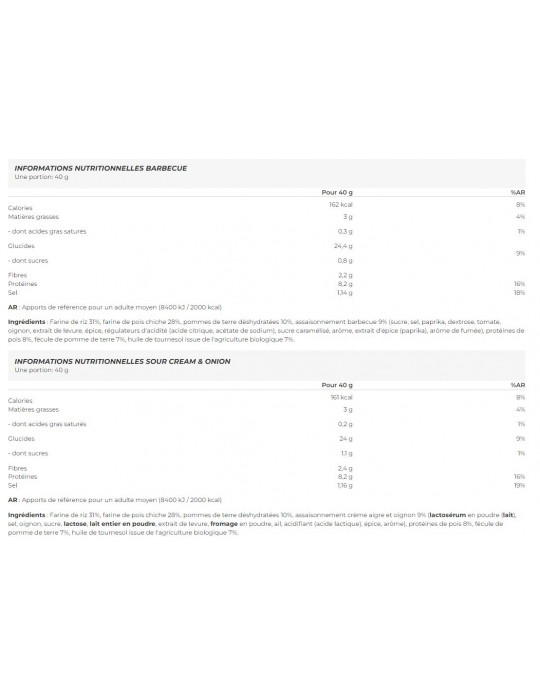 Ingredientes: Farinha de arroz 31%, farinha de grão-de-bico 28%, batata desidratada 10%, natas azedas e tempero de cebola 9%(soro de leite em pó(leite), sal, cebola, açúcar, lactose, leite gordo em pó, extrato de levedura, queijo em pó, alho, acidificante (ácido lático), especiarias, aromatizante), proteína de ervilha 8%, fécula de batata 7%, óleo de girassol biológico 7%.
