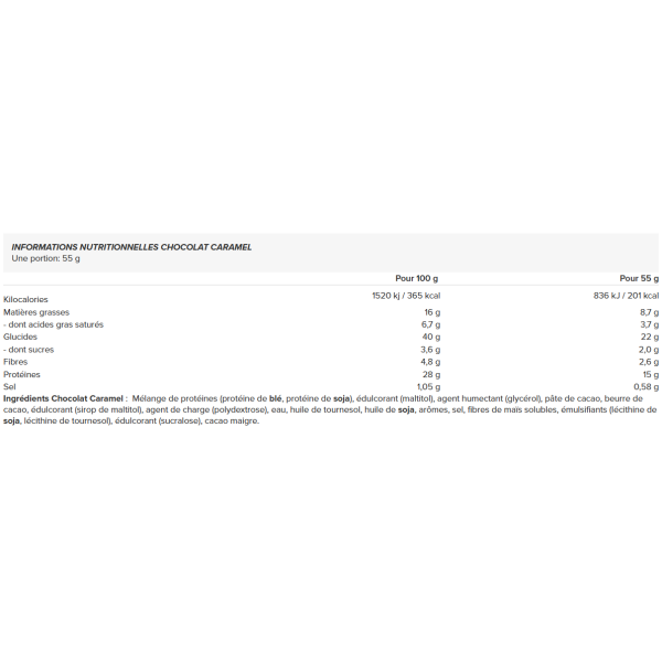 Ingredientes Avelã & Nougat: Mistura de proteínas(soja, ervilhas, arroz), humectante (glicerol), polidextrose, oligofrutose, edulcorantes (maltitol, sucralose), manteiga de cacau, avelãs, massa de cacau, óleo de girassol, farinha de arroz, cacau em pó, aromas, emulsionante (lecitina de soja).
