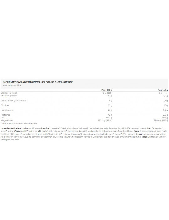 Ingredientes Morango e Arando: Aveia integral em flocos* (34%), xarope de açúcar invertido, maltodextrina*, crispies de cereais integrais (11%) [ farinha de trigo integral*, farinha de arroz*, açúcar*, farinha de cevada maltada*, farinha de trigo maltada*, sal, óleo de colza*, regulador de acidez (carbonato de cálcio), emulsionante (lecitina(soja))], arandos de frutos grandes cristalizados* (9%) (açúcar*, arandos de frutos grandes*, farinha de arroz*, óleo de girassol*), xarope de glucose, óleo de coco*, morangos* (3%), sementes de soja*, citrato de magnésio, sumo de limão concentrado*, sumo de maçã concentrado*, sal, aroma natural*, humectante (glicerol), acidificante (ácido cítrico), emulsionante (lecitinas(soja)), extrato de baunilha*. *de origem natural.