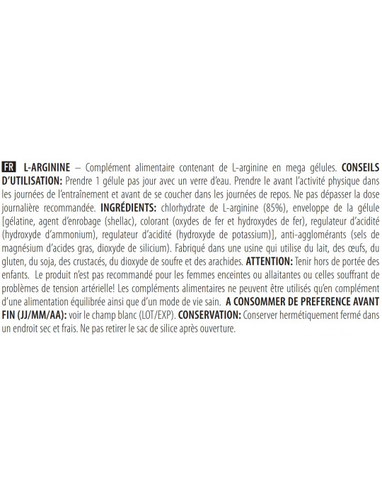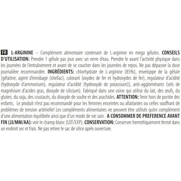 Ingredientes: [gélatine, agent d’enrobage (shellac), colorant (oxydes de fer et hydroxydes de fer), régulateur d’acidité (hydroxyde d’ammonium), régulateur d’acidité (hydroxyde de potassium)] Cloridrato de L-arginina (85%), invólucro da cápsula, agentes antiaglomerantes (sais de magnésio de ácidos gordos, dióxido de silício).