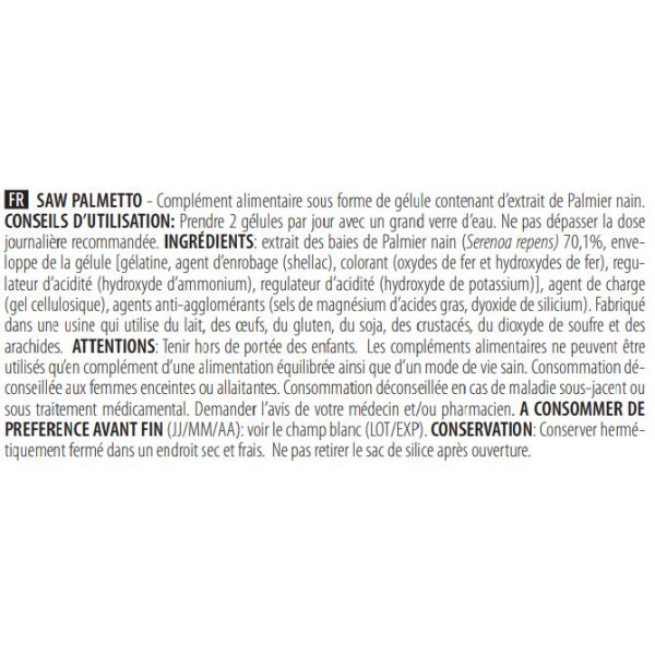 Este suplemento alimentar em forma de cápsula (peso: 0,92 g) contém essencialmente extrato de Saw Palmetto ( 640 mg por porção). O Saw palmetto, também conhecido por Sabal ou palmeira-serra, é utilizado para otimizar a produção hormonal. De uma forma mais geral, é utilizado para aliviar a hipertrofia da próstata.