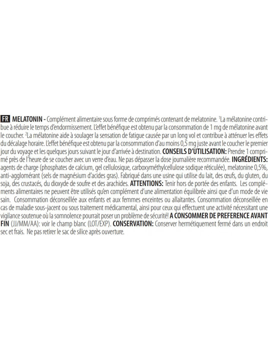 Produzida exclusivamente a partir de melatonina (1 mg por dose), o principal objetivo de Melatonin (90 comprimidos) é reduzir o tempo necessário para adormecer. De facto, a toma de 1 mg de melatonina reduz o tempo necessário para adormecer antes de deitar. Além disso, esta hormona ajuda igualmente a reduzir a sensação de cansaço provocada por treinos intensos ou viagens longas com jet lag.