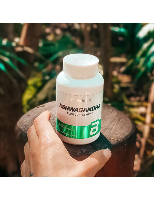 Ashwagandha (60 caps) da marca Biotech USA é um suplemento alimentar à base de ashwagandha em forma de cápsula (peso de uma cápsula: 0,94 g).
