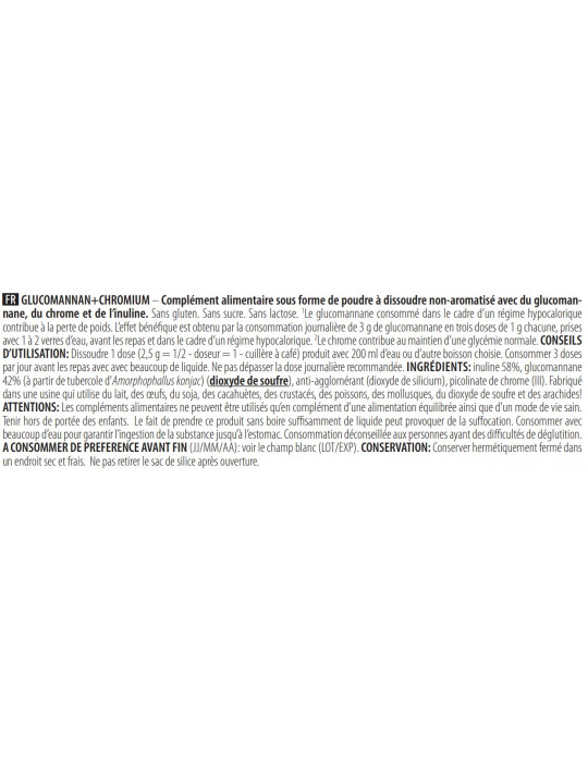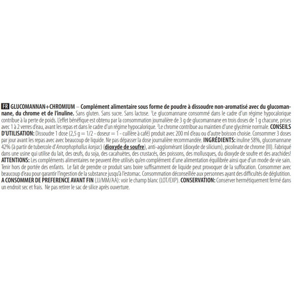 Glucomannan + crómio (225 g) é um suplemento alimentar sem lactose, sem açúcar e sem glúten.