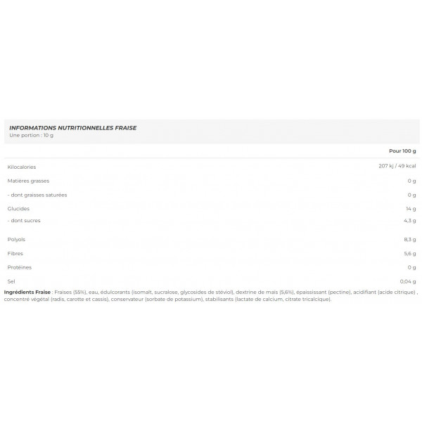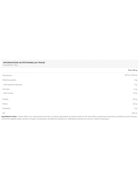 Ingredientes Morango: Morangos (55%), água, edulcorantes (isomalte, sucralose, glicosídeos de esteviol), dextrina de milho (5,6%), espessante (pectina), acidificante (ácido cítrico), concentrado de vegetais (rabanete, cenoura e groselha preta), conservante (sorbato de potássio), estabilizadores (lactato de cálcio, citrato tricálcico).