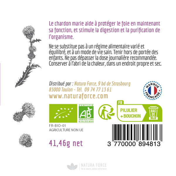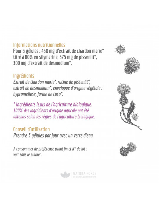 Cápsulas de cardo mariano (90 cápsulas) da marca francesa Natura Force são fabricadas com Cardo mariano, Desmodium e Dente-de-leão biológicos. Este produto contém ingredientes provenientes da agricultura biológica.
