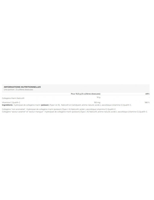 Ingredientes: hidrolisado de colagénio marinho (peixe) (Tipo l e lll), Naticol® e Cartidyss®, aroma natural, ácido L-ascórbico (vitamina C) Quali®-C.