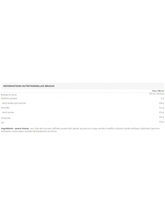 Ingredientes - Sabor a Bravas: água, óleo de girassol refinado, alho em pó, especiarias, sal, pimento vermelho, amido modificado, acidulante (ácido acético), estabilizante (goma xantana), conservante (sorbato de potássio) e aroma.