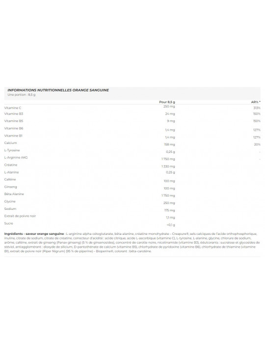 Ingredientes - aroma de laranja sanguínea l-arginina-alfa-cetoglutarato, beta-alanina, creatina mono-hidratada - Creapure®, sais de cálcio do ácido ortofosfórico, inulina, citrato de sódio, citrato de creatina, regulador de acidez : ácido cítrico, ácido L-ascórbico (vitamina C), L-tirosina, L-alanina, glicina, cloreto de sódio, aroma, cafeína, extrato de ginseng (Panax ginseng) (5% de ginsenósidos), concentrado de cenoura preta, nicotinamida (vitamina B3), edulcorantes : sucralose e glicosídeos de esteviol, antiaglomerante: dióxido de silício, D-pantotenato de cálcio (vitamina B5), cloridrato de piridoxina (vitamina B6), cloridrato de tiamina (vitamina B1), extrato de pimenta preta (Piper Nigrum) (95% piperina) - Bioperine®, corante: beta-caroteno.