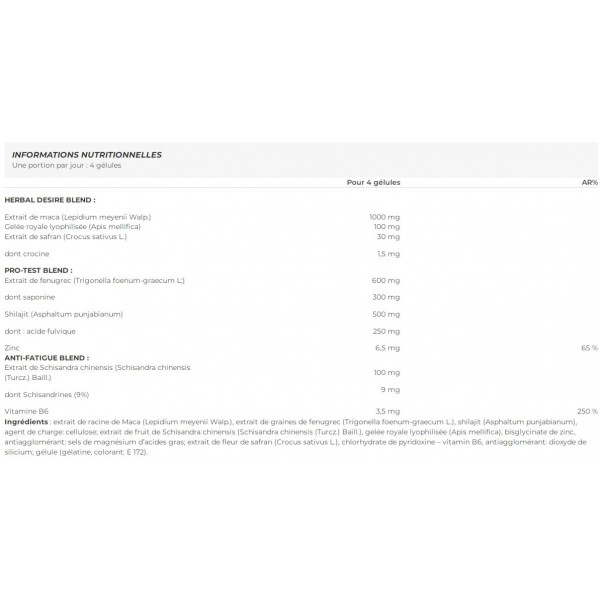 Ingredientes: Extrato de raiz de maca (Lepidium meyenii Walp.), extrato de semente de feno-grego (Trigonella foenum-graecum L.), shilajit (Asphaltum punjabianum), agente de volume: celulose; extrato de fruto de Schisandra chinensis (Schisandra chinensis (Turcz.) Baill.), geleia real liofilizada (Apis mellifica), bisglicinato de zinco, antiaglomerante: sais de magnésio de ácidos gordos; extrato de flor de açafrão (Crocus sativus L.), cloridrato de piridoxina - vitamina B6, antiaglomerante: dióxido de silício; cápsula (gelatina, corante: E 172).