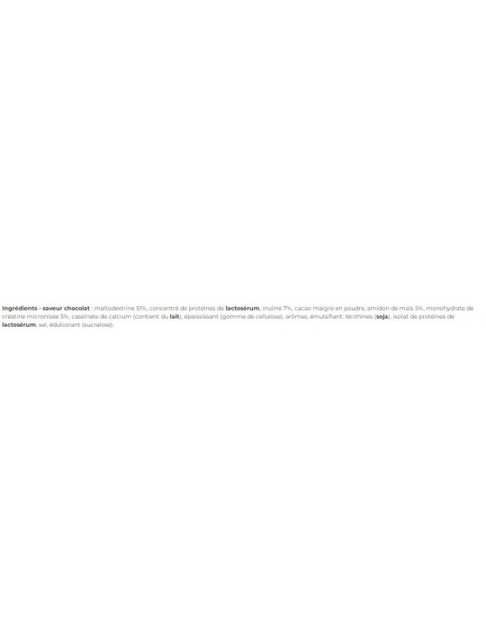 Ingredientes - Sabor a chocolate: maltodextrina 51%, concentrado de proteínas de soro de leite, inulina 7%, cacau em pó magro, amido de milho 5%, creatina monohidratada micronizada 5%, caseinato de cálcio (contém leite), espessante (goma de celulose), aromas, emulsionante: lecitinas(soja), proteína isolada de soro de leite, sal, edulcorante (sucralose).