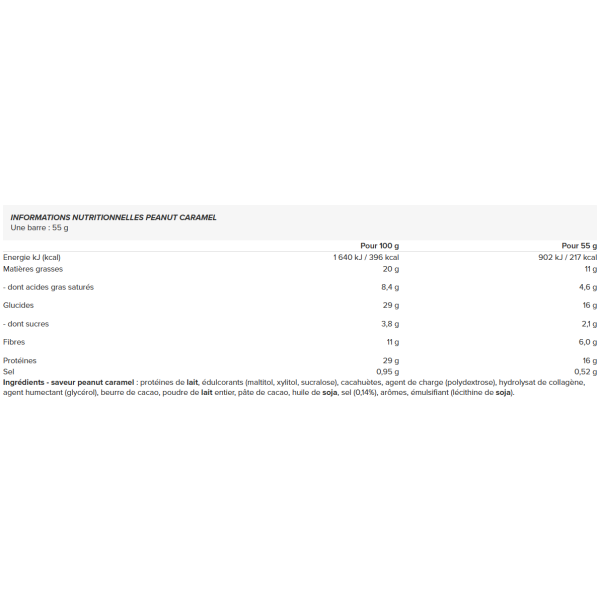 Ingredientes - Sabor a caramelo de amendoim: proteína de leite, edulcorantes (maltitol, xilitol, sucralose), amendoins, agente de volume (polidextrose), hidrolisado de colagénio, humectante (glicerol), manteiga de cacau, leite gordo em pó, massa de cacau, óleo de soja, sal (0,14%), aromas, emulsionante (lecitina de soja)