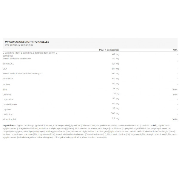 Ingredientes: [stabilisants (copolymère greffé d'alcool polyvinylique et de polyéthylèneglycol, alcool polyvinylique), anti-agglomérants (talc, mono- et diglycérides d'acides gras)] agente de volume (gel de celulose), CLA em pó [glicéridos (ricos em CLA), xarope de milho seco, caseinato de sódio (contém leite), agente antiaglomerante (dióxido de silício), estabilizador (difosfatos)] (12,6%), lecitina de girassol, revestimento, gluconato de zinco, extrato de frutos de Garcinia Cambogia (2,4%), inulina, L-carnitina-L-tartarato (2%), L-tirosina (1,2%), extrato de folhas de chá verde (Camellia sinensis) (1,2%), L-metionina (1%), L-lisina (0,5%), acetil L-carnitina (0,5%), antiaglomerante (sais de magnésio de ácidos gordos), cloridrato de piridoxina, cloreto de crómio (III)