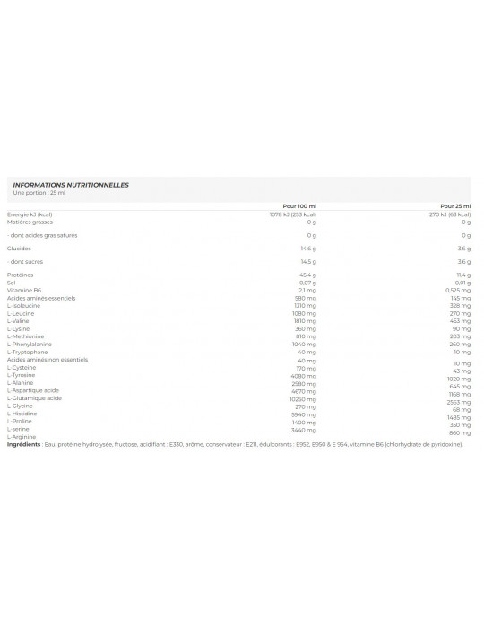 Para além destes aminoácidos, esta bebida contém também BCAAs de origem natural e é enriquecida com vitamina B6. A vitamina B6 contribui para o normal metabolismo energético, para o normal metabolismo das proteínas e do glicogénio, bem como para a redução da fadiga.
