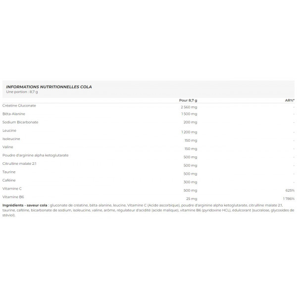 Ingredientes - sabor a cola : gluconato de creatina, beta-alanina, leucina, vitamina C (ácido ascórbico), alfa-cetoglutarato de arginina em pó, malato de citrulina 2:1, taurina, cafeína, bicarbonato de sódio, isoleucina, valina, aroma, regulador de acidez (ácido málico), vitamina B6 (piridoxina HCL), edulcorante (sucralose, glicosídeos de esteviol).