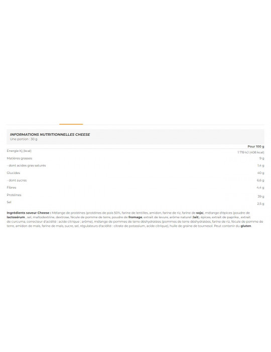 Ingredientes sabor a queijo :Mistura de proteínas (proteína de ervilha 50%, farinha de lentilhas, amido, farinha de arroz, farinha de trigo)soja), uma mistura de especiarias ( soro de leite , sal, maltodextrina, dextrose, fécula de batata, sulfato de potássio em póqueijoExtrato de levedura, aroma natural (leite), especiarias, extrato de paprica, extrato de curcuma, regulador de acidez: ácido cítrico; aromatizante), mistura de batata desidratada (batata desidratada, farinha de arroz, fécula de batata, amido de milho, farinha de milho, açúcar, sal, reguladores de acidez: citrato de potássio, ácido cítrico), óleo de sementes de girassol. Pode conterglúten.