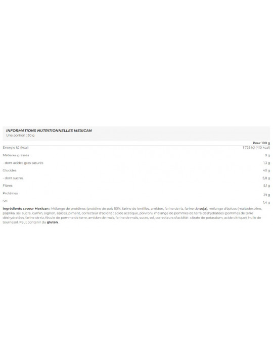 Ingredientes sabor mexicano :Mistura de proteínas (proteína de ervilha 50%, farinha de lentilhas, amido, farinha de arroz, farinha de trigo)soja), mistura de especiarias (maltodextrina, paprica, sal, açúcar, cominhos, cebola, especiarias, malagueta, regulador de acidez: ácido acético, pimenta), mistura de batata desidratada (batata desidratada, farinha de arroz, fécula de batata, amido de milho, farinha de milho, açúcar, sal, reguladores de acidez: citrato de potássio, ácido cítrico), óleo de girassol. Pode conterglúten.